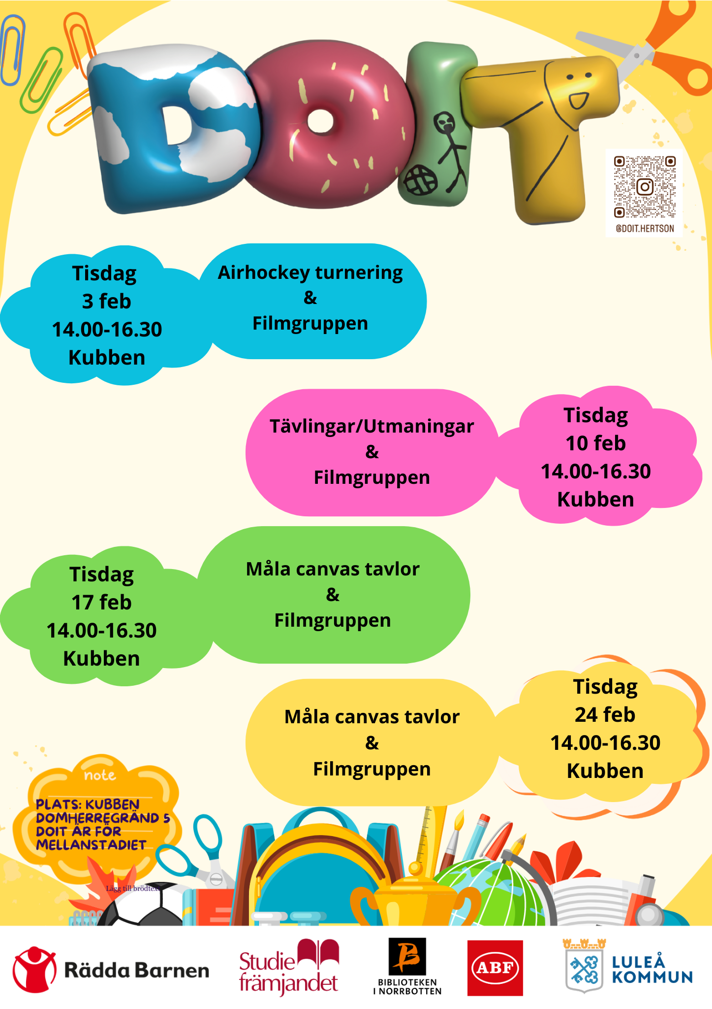 DOIT i Luleå är ett samarbete mellan Rädda Barnen, Luleå kommun (barn- och utbildningsförvaltningen, kultur- och fritidsförvaltningen) för att skapa trygga mötesplatser för barn 9–12 år.